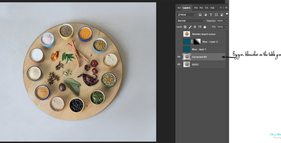 It’s important to remember that colour is a visual design element that adds interest to the image. In order for the warm colours of the spices on the board to stand out, I used a blue background. Blue, a cool colour when used with warm colours tends to recede, making the warm colours stand out.